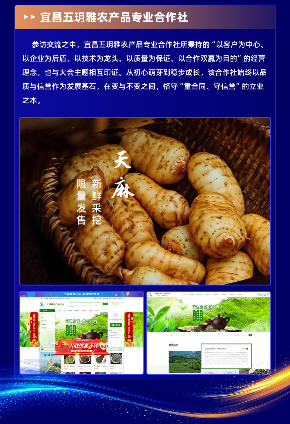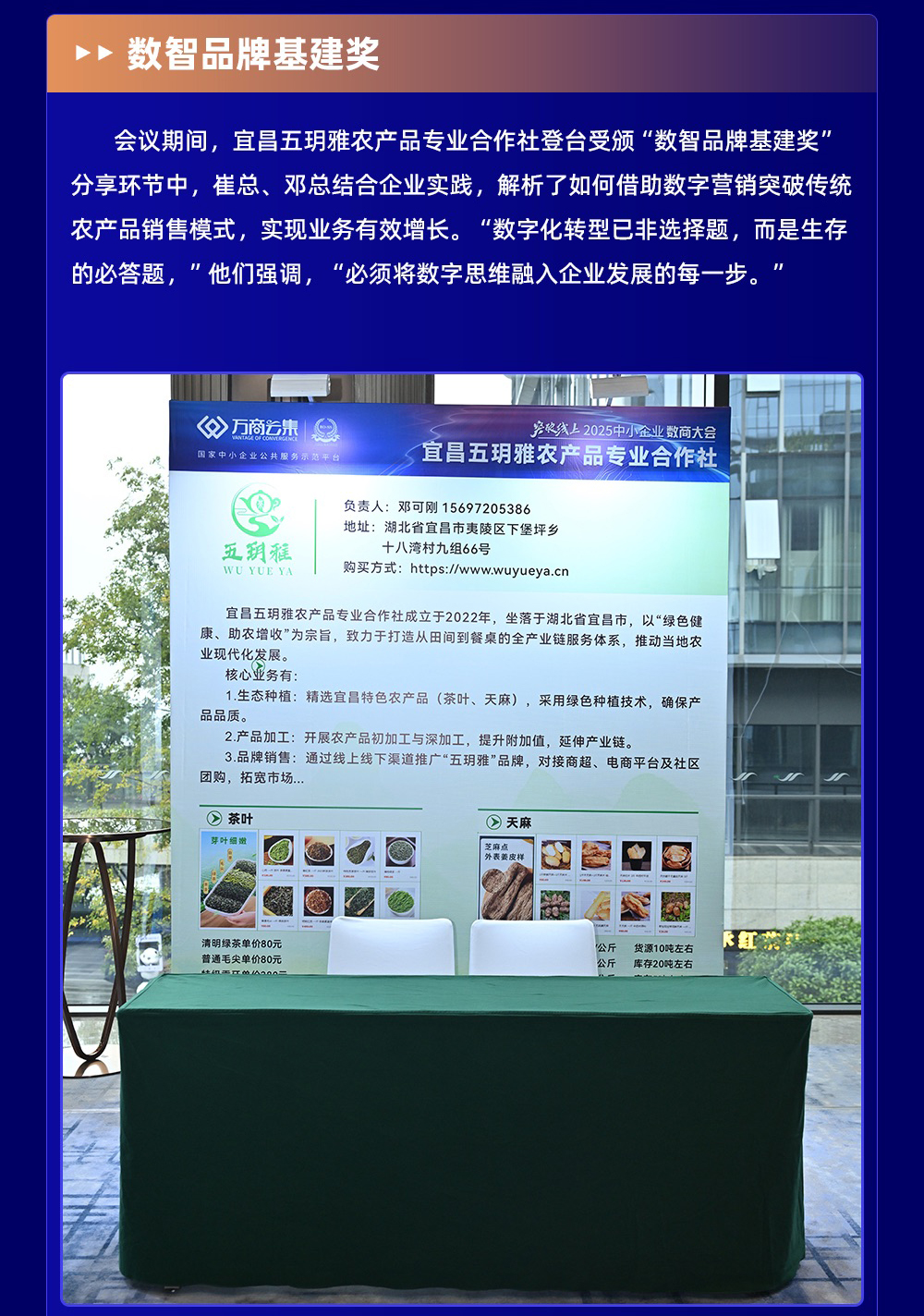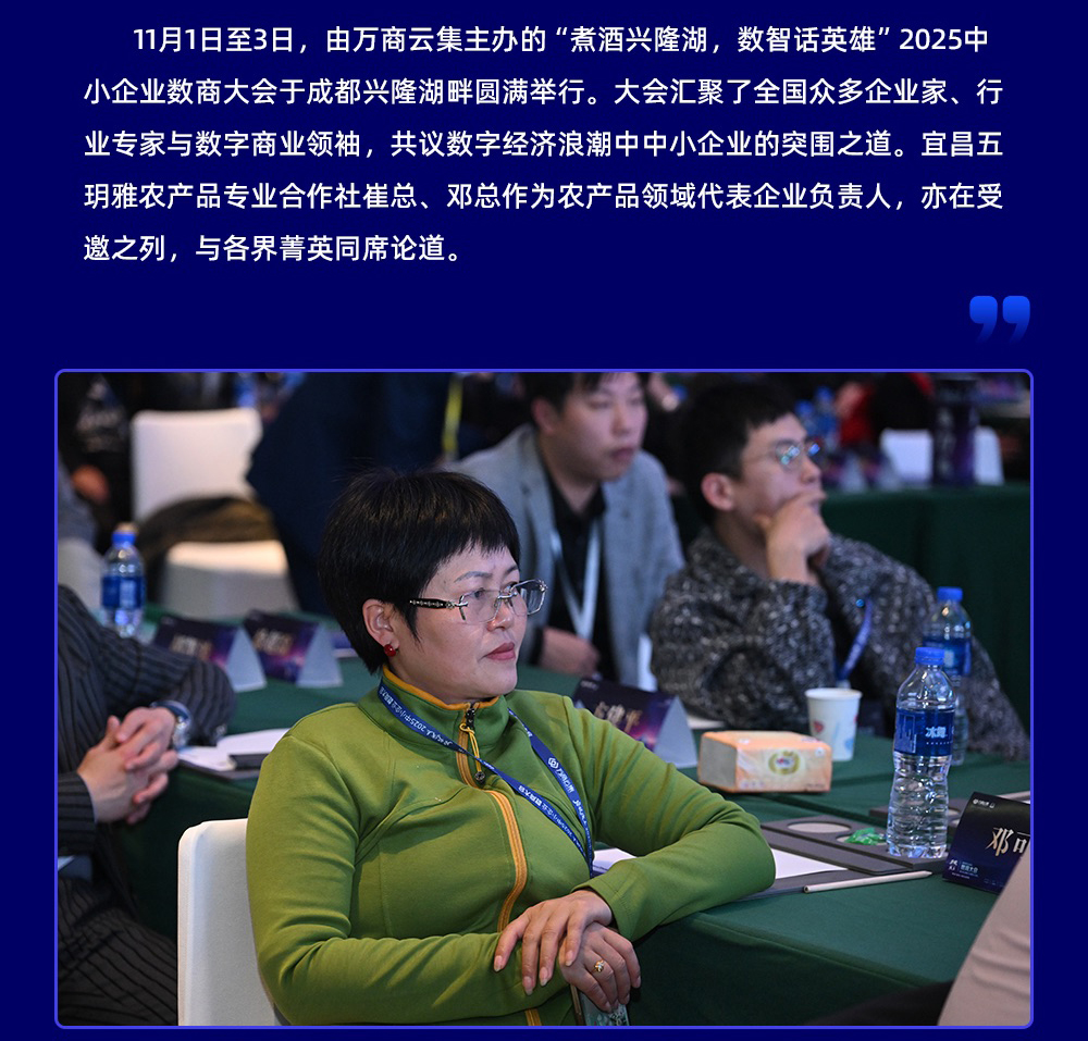 11月1日至3日,由万商云集主办的“煮酒兴隆湖,数智话英雄”2025中小企业数商大会于成都兴隆湖畔圆满举行。大会汇聚了**众多企业家、行业专家与数字商业家,共议数字经济浪潮中中小企业的突围之道。宜昌五玥雅农产品专业合作社崔总、邓总作为农产品领域代表企业负责人,亦在受邀之列,与各界菁英同席论道。