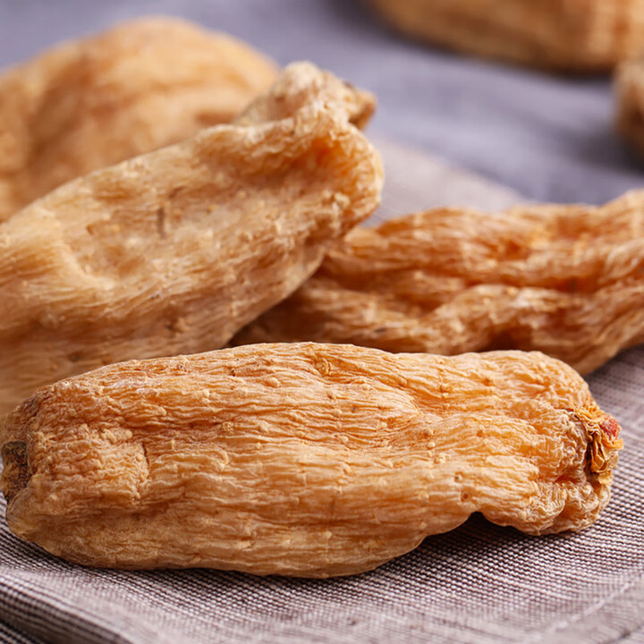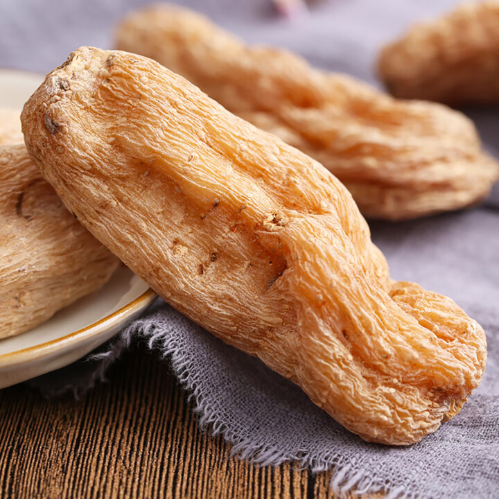 天麻为兰科植物天麻的干燥块茎。立冬后至次年清明前采挖,立即洗净,蒸透,敞开低温干燥。呈椭圆形或长条形,略扁,皱缩而稍弯曲,长3~15cm,宽1.5~6cm,厚0.5~2cm。表面黄白色至黄棕色,有纵皱纹及由潜伏芽排列而成的横环纹多轮,有时可见棕褐色菌索。顶端有红棕色至深棕色鹦嘴状的芽或残留茎基;另端有圆脐形疤痕。质坚硬,不易折断,断面较平坦,黄白色至淡棕色,角质样。气微,味甘。