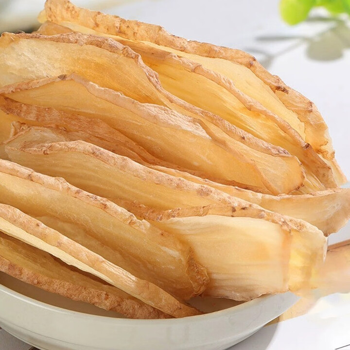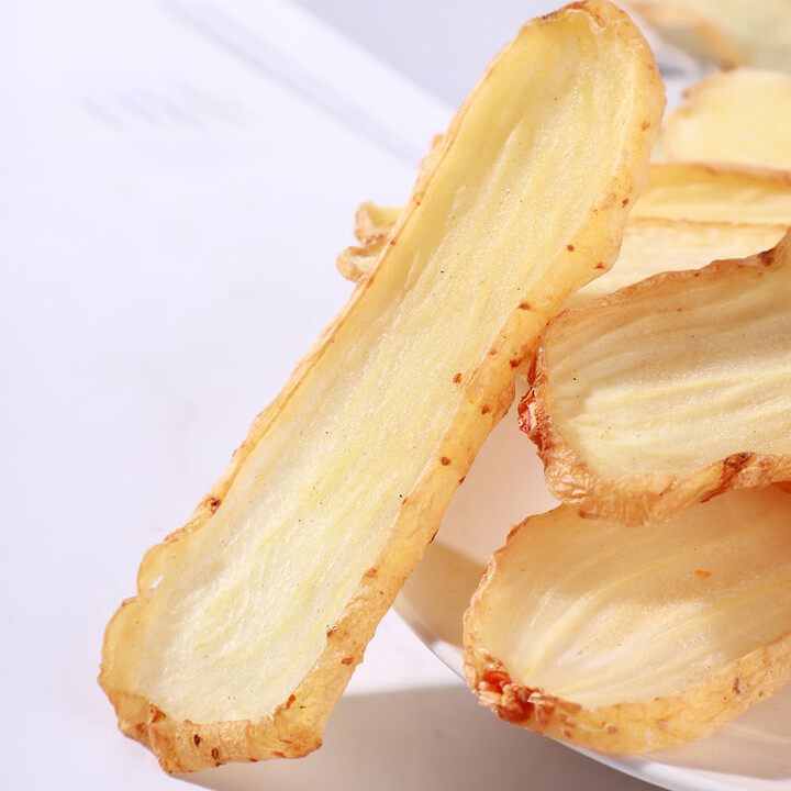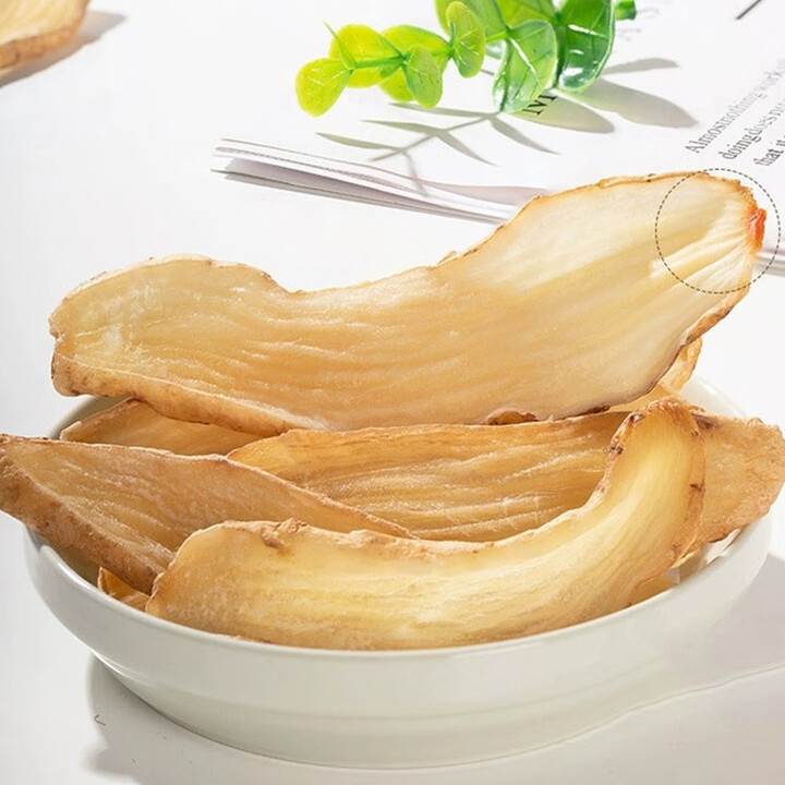 天麻为兰科植物天麻的干燥块茎。立冬后至次年清明前采挖,立即洗净,蒸透,敞开低温干燥。呈椭圆形或长条形,略扁,皱缩而稍弯曲,长3~15cm,宽1.5~6cm,厚0.5~2cm。表面黄白色至黄棕色,有纵皱纹及由潜伏芽排列而成的横环纹多轮,有时可见棕褐色菌索。顶端有红棕色至深棕色鹦嘴状的芽或残留茎基;另端有圆脐形疤痕。质坚硬,不易折断,断面较平坦,黄白色至淡棕色,角质样。气微,味甘。